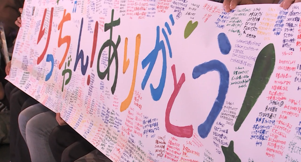 卒業コメントを募るブースに来て、横断幕にコメントを書いていたちより父 pic.twitter.com/MQhOBBwC0m