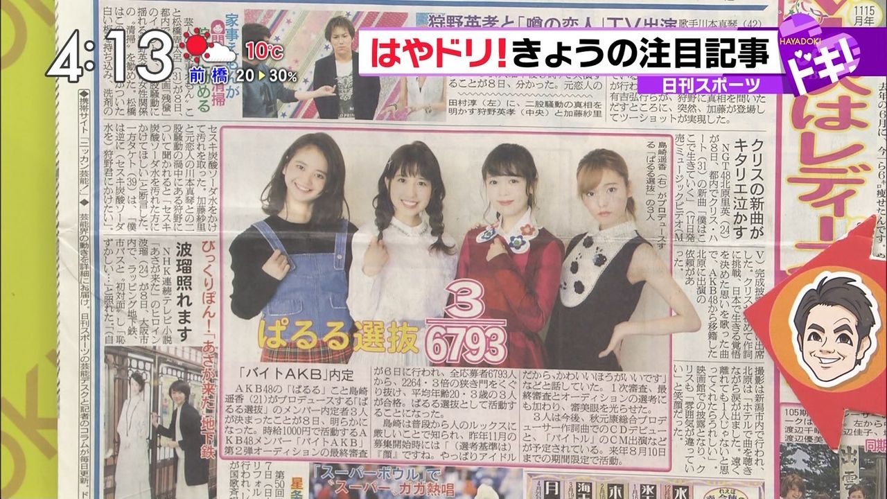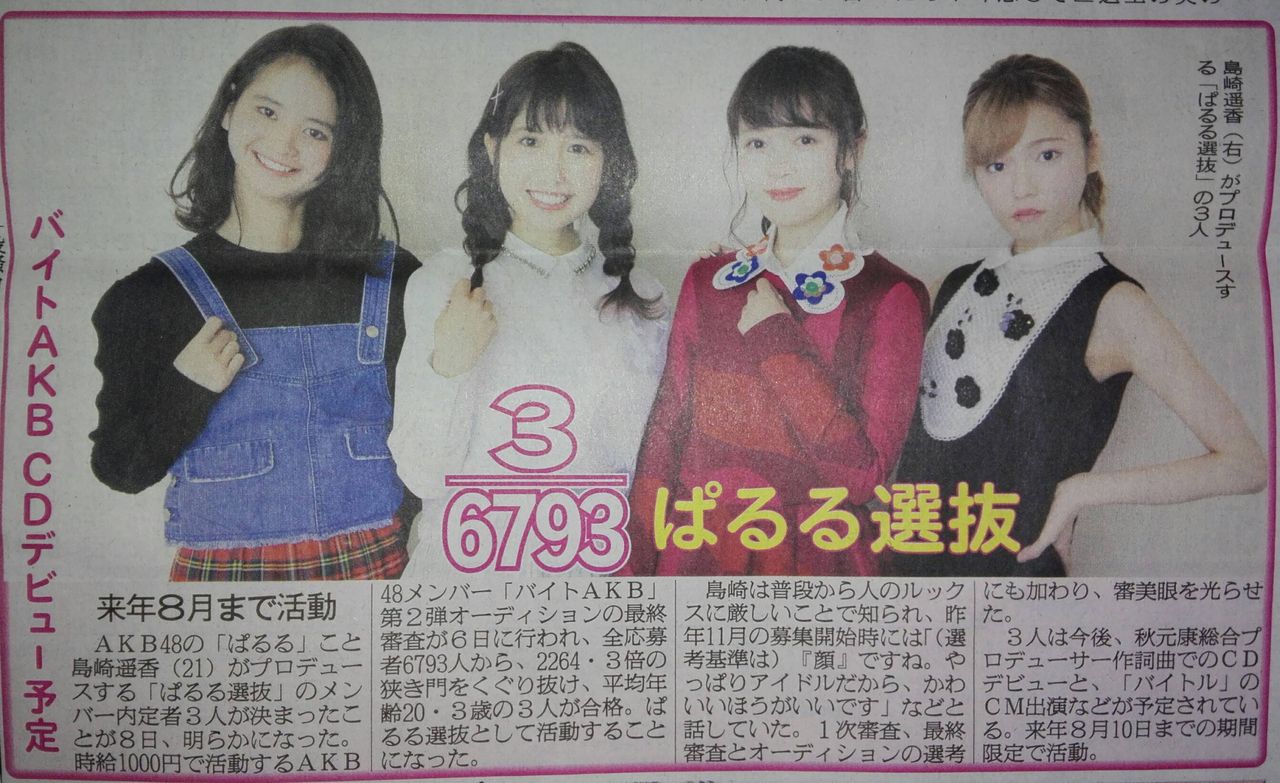 人気アイドルグループ・AKB48がアルバイト求人情報サイト「バイトル」とコラボレーションした『バイトAKB』企画第2弾として、島崎遥香が選んだ「ぱるる選抜」最終合格内定者3人が決まったことを発表した。