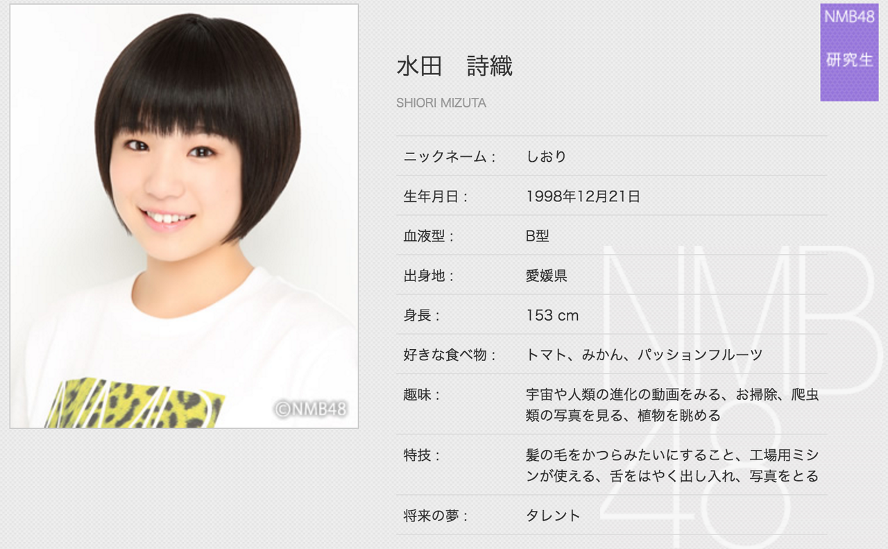 水田詩織(みずた・しおり)1998年12月21日生まれ、愛媛県出身、高校3年生、17歳、B型、しおり