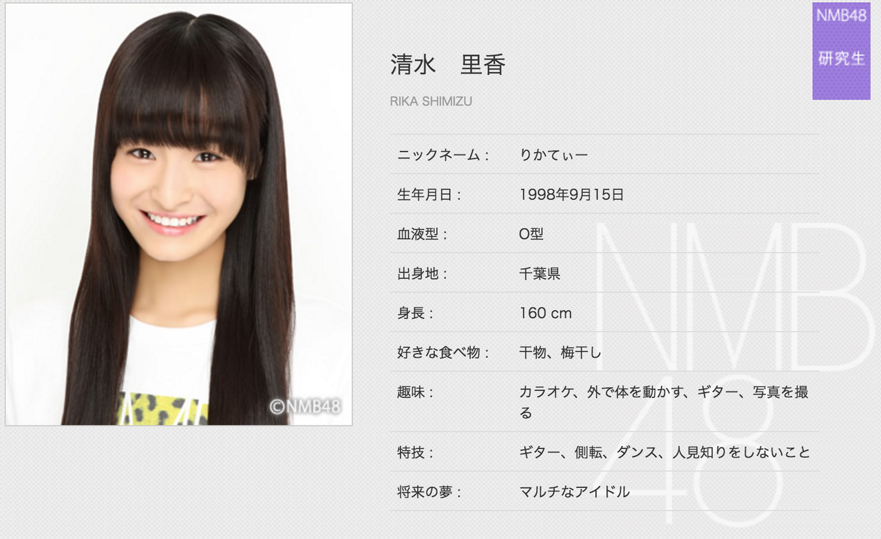 清水里香(しみず・りか)1998年9月15日生まれ、千葉県出身、高校3年生、17歳、O型、りかてぃー