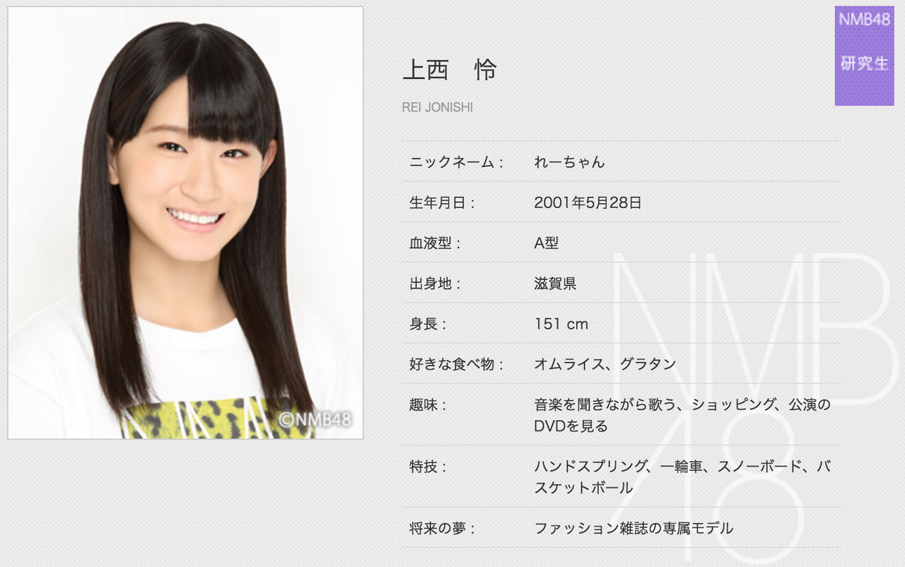 上西怜(じょうにし・れい)2001年5月28日生まれ、滋賀県出身、中学3年生、15歳、A型、れーちゃん