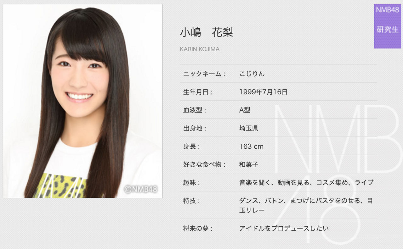 小嶋花梨(こじま・かりん)1999年7月16日生まれ、埼玉県出身、高校2年生、16歳、A型、こじりん