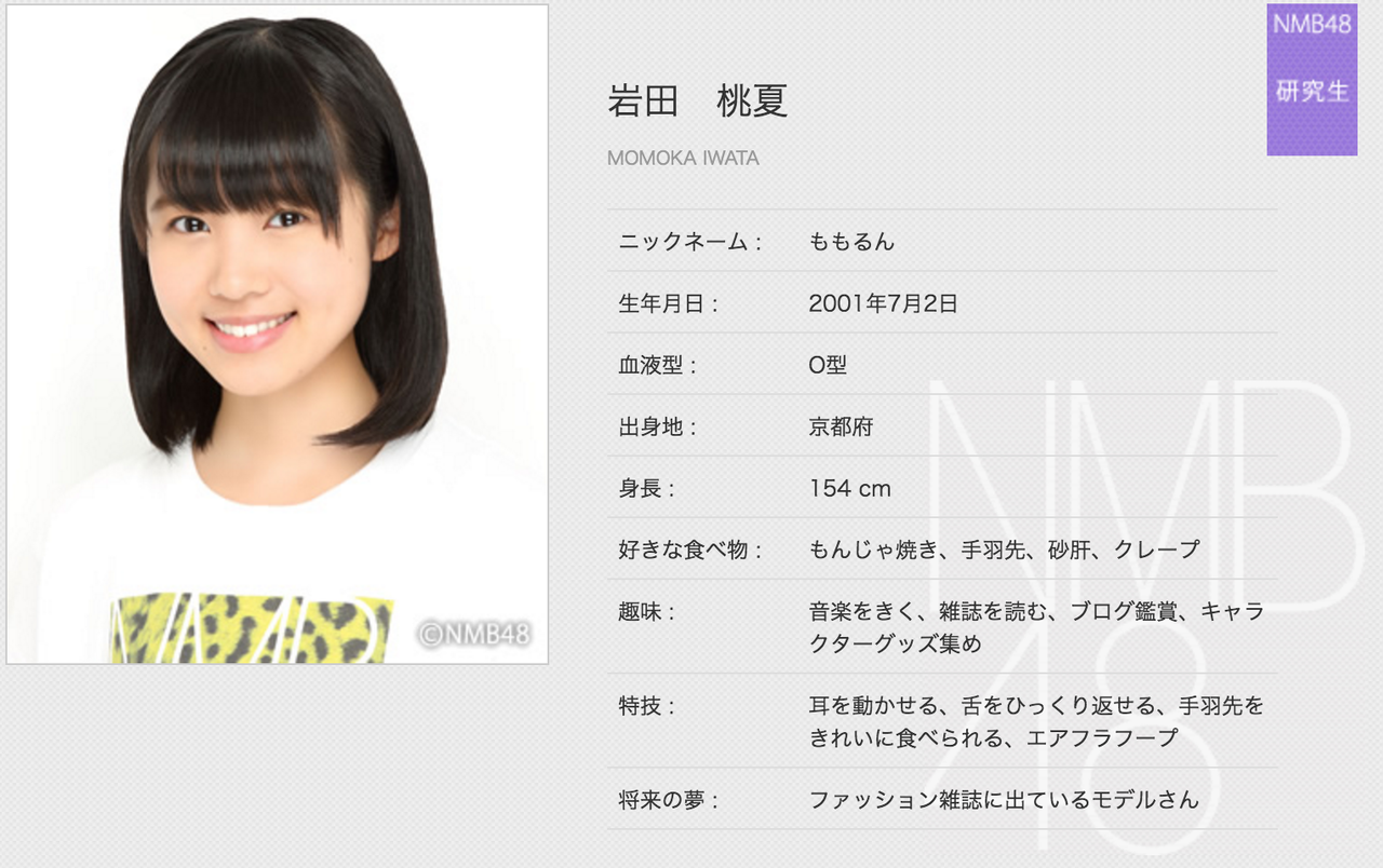 岩田桃夏(いわた・ももか)2001年7月2日生まれ、京都府出身、中学3年生、14歳、O型、ももるん