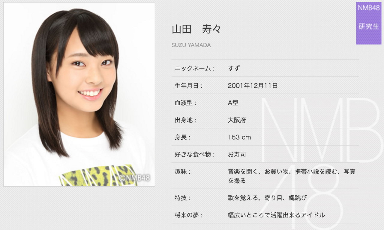 山田寿々(やまだ・すず)2001年12月11日生まれ、大阪府出身、中学3年生、14歳、A型、すず