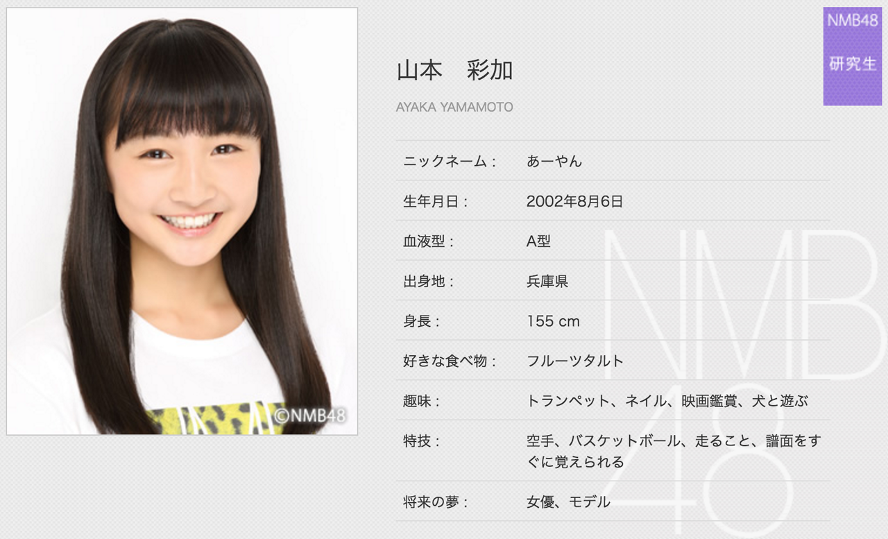 山本彩加(やまもと・あやか)2002年8月6日生まれ、兵庫県出身、中学2年生、13歳、A型、あーやん