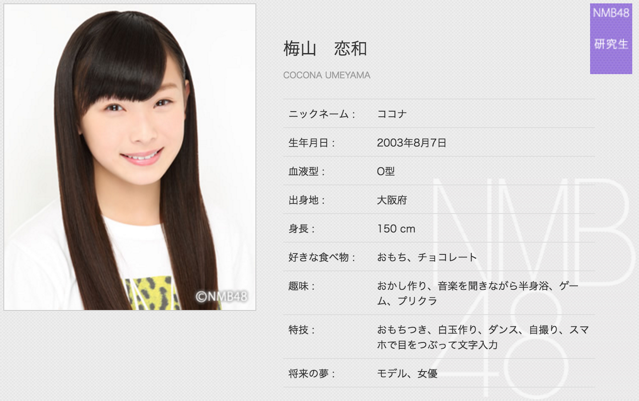 梅山恋和(うめやま・ここな)2003年8月7日生まれ、大阪府出身、中学1年生、12歳、O型、ココナ