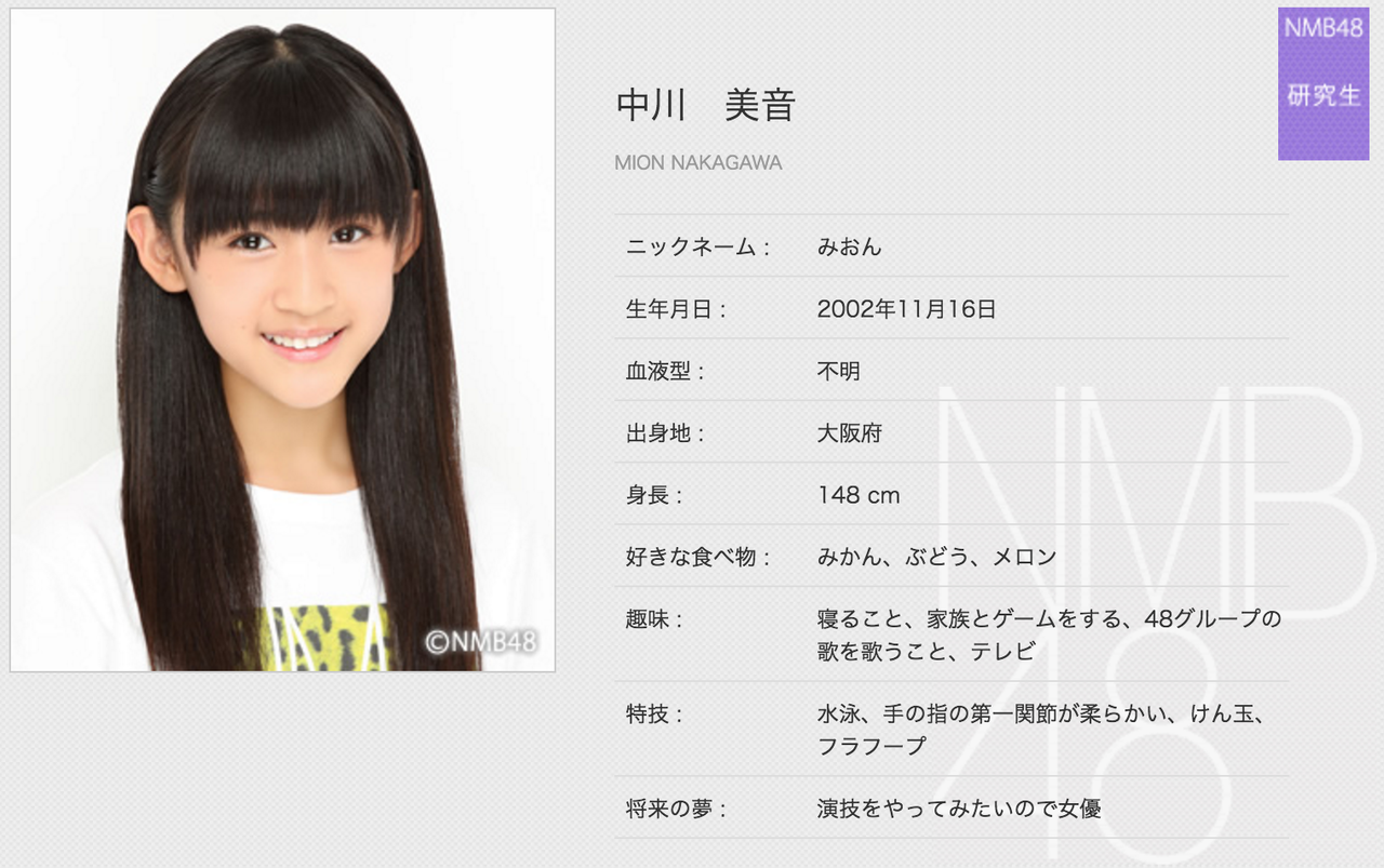 中川美音(なかがわ・みおん)2002年11月16日生まれ、大阪府出身、中学2年生、13歳、血液型不明、みおん
