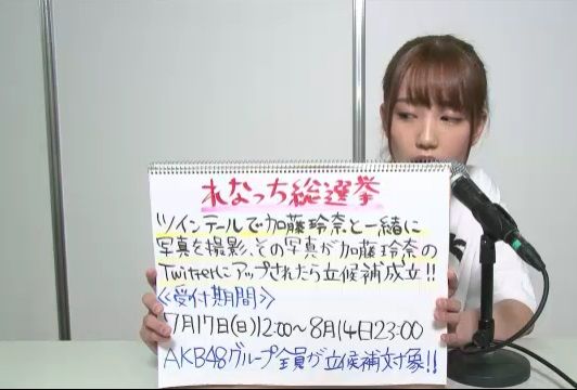 立候補の条件 ツインテールで加藤玲奈と一緒に写真を撮り、その写真が加藤玲奈のツイッターにアップされること。