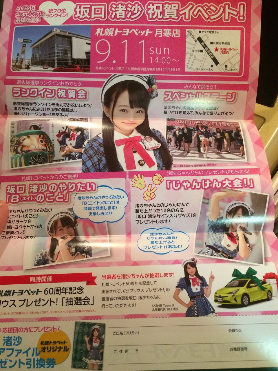 札幌トヨペットでは、6月に選抜総選挙に向けた壮行会も開催。坂口渚沙が来店し、400名近くの参加者の皆さんに激励していただき、"だるまの目入れ"にも挑戦しました。今回は、