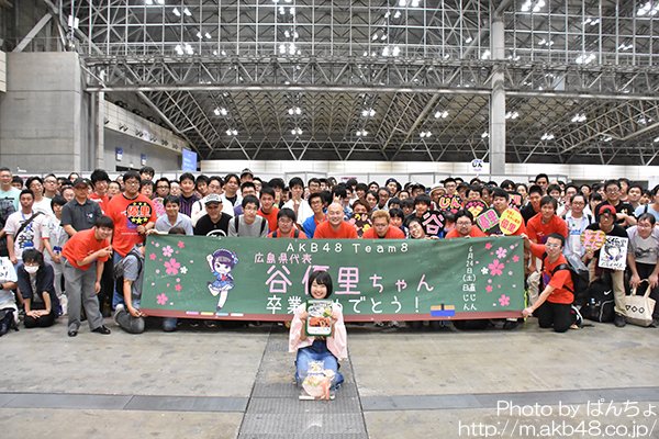 http://toyota-team8.jp/news/chugoku_shikoku/20170624-314034623172456.php6月24日(土)に幕張メッセで開催されました〈 AKB48 47thシングル『シュートサイン』劇場盤 発売記念大握手会〉をもちまして、広島県代表・谷優里(タニ ユウリ)がAKB48チーム8としての活動を終了いたしました。2014年4月3日(木)より3年間、谷優里を応援いただきありがとうございました。なお、今回の卒業を受け、新たな広島県代表メンバーを選考すべく、6月26日(月)よりオーディションの応募受付を開始いたします。 詳細に関する発表をお待ちください。また、同じくチーム8からの卒業を発表しております徳島県代表・濵松里緒菜(ハママツ リオナ)におきましても、最後の握手会となりましたことをご報告させていただきます。7月2日(日)に行われるAKB48劇場での卒業公演が最終活動日となります。引き続き応援のほどよろしくお願いいたします。