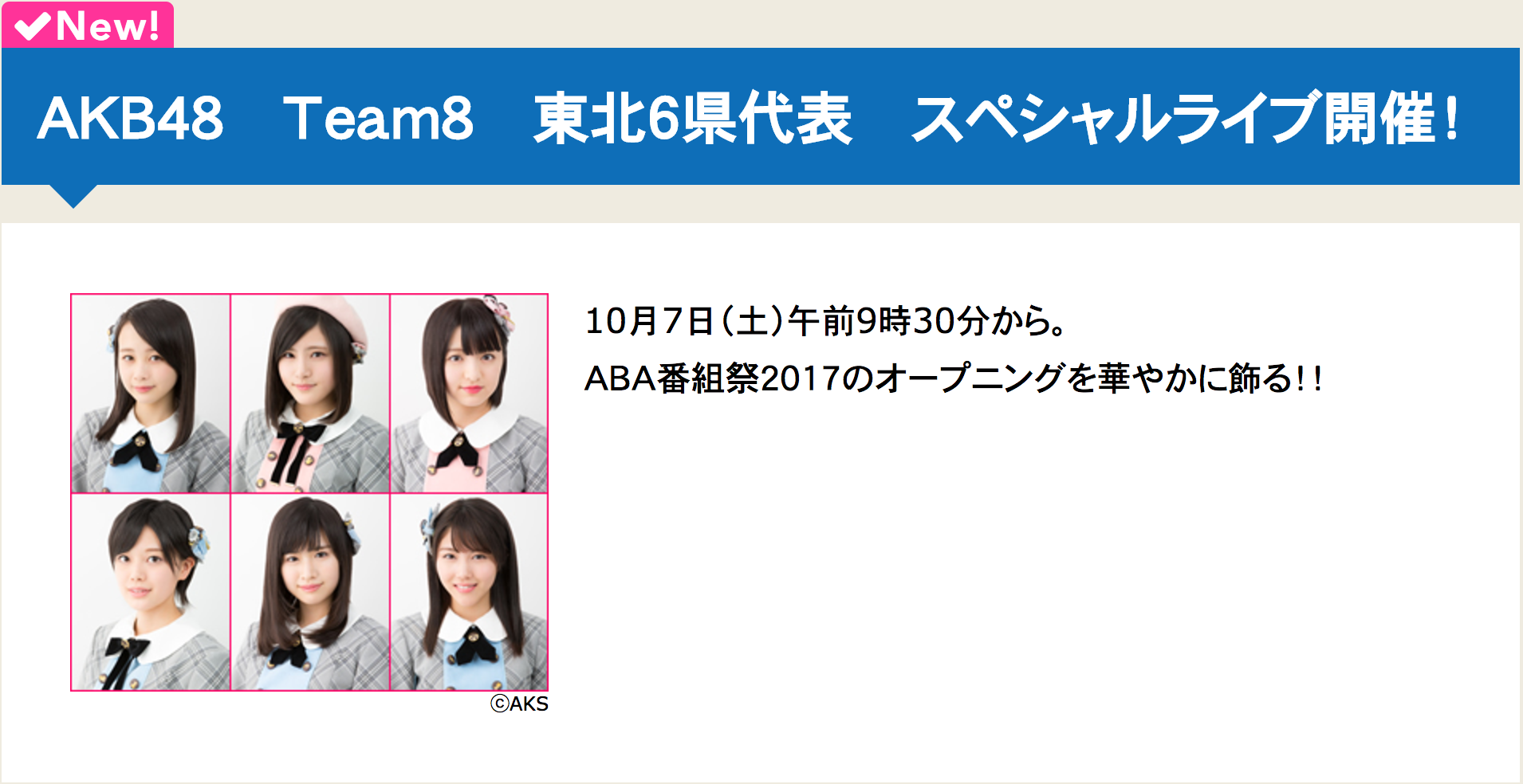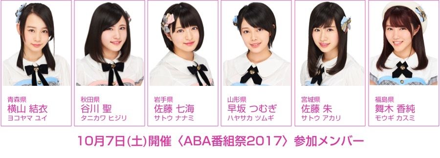 10月7日(土)、今年も青森市・ねぶたの家 ワ・ラッセ&西の広場で行われるABA青森朝日放送のイベントに、AKB48チーム8メンバーが参加します! 青森県代表・横山結衣(ヨコヤマ ユイ)、秋田県代表・谷川聖(タニカワ ヒジリ)、岩手県代表・佐藤七海(サトウ ナナミ)、山形県代表・早坂つむぎ(ハヤサカ ツムギ)、宮城県代表・佐藤朱(サトウ アカリ)、福島県代表・舞木香純(モウギ カスミ)の東北メンバー6人が、スペシャルライブステージを行います!また当日は、イベント会場から生中継でお届けする、ABA青森朝日放送の特番「テレビの前でも楽しんで!今年は2時間生放送!!ABA番組祭2017」(12:00〜14:00放送)に出演! チーム8が出演するのは今年で4年連続となります。番組司会はあべこうじさんと、ABA青森朝日放送の稲葉千秋アナウンサー。恒例のチーム対抗クイズ大会では、さまざまなジャンルのクイズが出題されます。サッカー元日本代表・前園真聖さんが参加したPK対決や、Bリーグ青森ワッツ・下山大地選手の3ポイントシュートチャレンジなどは要注目です! さらに、チーム8のあのメンバーからも出題が!? チーム8東北メンバー6人は、昨年に続き優勝を目指します!皆さん、ぜひ会場まで遊びに来てください!《青森県:2017年10月7日(土)・8日(日)》ABA番組祭2017[会場]ねぶたの家 ワ・ラッセ&西の広場(青森県青森市安方1-1-1)[開催日時]10月7日(土)・8日(日)◯チーム8東北6県代表 スペシャルLIVE10月7日(土) 9:30〜10:00※チーム8の出演は7日(土)のみです。[入場料]無料[参加メンバー]横山結衣(青森県)/谷川聖(秋田県)/佐藤七海(岩手県)/早坂つむぎ(山形県)/佐藤朱(宮城県)/舞木香純(福島県)※参加メンバーは体調不良等の理由により、不参加となる場合がありますことを予めご了承ください。イベントの詳細はこちらをご覧ください。《番組概要》タイトル :「テレビの前でも楽しんで!今年は2時間生放送!!ABA番組祭2017」放送日時 :2017年10月7日(土) 12:00〜14:00生放送司会 :あべこうじ、稲葉千秋(ABAアナウンサー)放送局 :ABA青森朝日放送放送エリア:青森県内