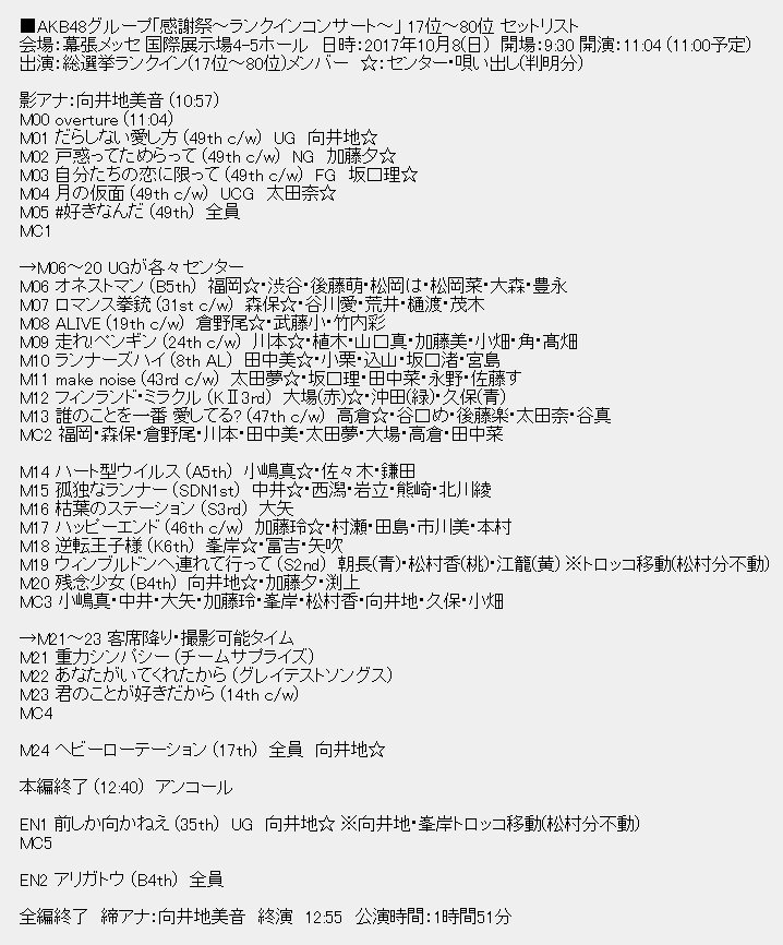 ■AKB48グループ「感謝祭~ランクインコンサート~」 17位~80位 セットリスト