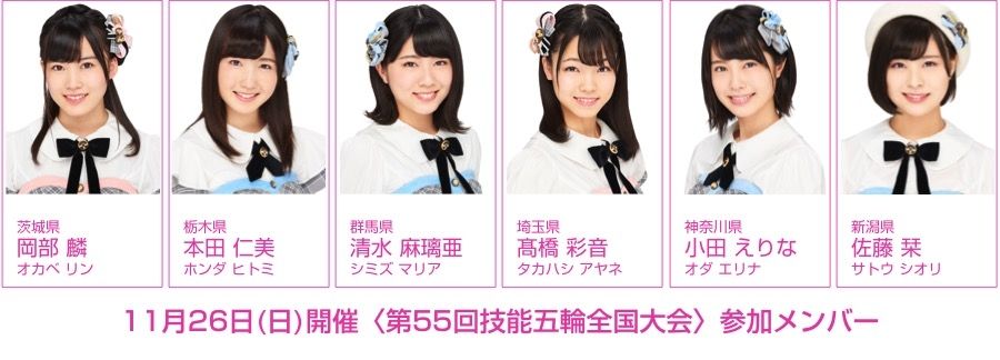 11月26日(日)、栃木県で開催される〈第55回技能五輪全国大会〉の会場、宇都宮市体育館で、AKB48チーム8がスペシャルライブを行います。〈技能五輪全国大会〉は、青年技術者の技能レベル日本一を競う大会で、将来日本を支える技能者を育てることや「ものづくり」の大切さを知ってもらうことを目的に開催されています。たくさんの方のご来場をお待ちしています!《栃木県:2017年11月26日(日)》第55回技能五輪全国大会[会場]宇都宮市体育館(栃木県宇都宮市元今泉5-6-18)[開催日程]11月25日(土)・26日(日)※チーム8のスペシャルライブは26日(日)のみとなります。[出演日時]11月26日(日) 12:40〜13:20[入場料]入場・ライブ観覧無料[参加メンバー]岡部麟(茨城県)/本田仁美(栃木県)/清水麻璃亜(群馬県)/髙橋彩音(埼玉県)/小田えりな(神奈川県)/佐藤栞(新潟県)※参加メンバーは体調不良等の理由により、不参加となる場合がありますことを予めご了承ください。詳細はこちらをご覧ください。