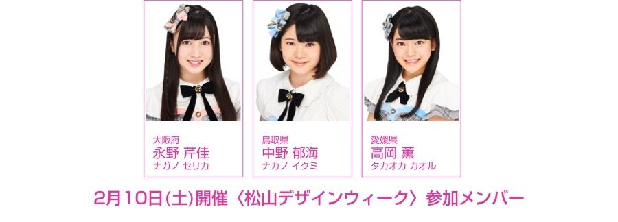 2月9日(金)〜12日(月・祝)の4日間に渡って開催される〈松山デザインウィーク〉に、AKB48チーム8が参加します! メンバーは、地元・愛媛県代表の高岡薫(タカオカ カオル)と、大阪府代表・永野芹佳(ナガノ セリカ)、鳥取県代表・中野郁海(ナカノ イクミ)の3名です。〈松山デザインウィーク〉は、Design Association npo(東京都港区、理事長:川崎健二)が手がけるJAPAN DESIGN WEEK 地方創生プロジェクトの一環で、四国では初めての取り組みとしてスタートします。地域住民を対象に、郷土愛の醸成や人材育成、クリエイティブによる地域活性化を目的としています。チーム8は、10日(土)に行われる「音話祭」と「ピーヒャラ」に登場します。「音話祭」は松山市の中心部、大街道商店街の特設ステージで開催される、感性に訴えかける音楽ライブ。「ピーヒャラ」は、「音話祭」出演アーティストが、市内を練り歩く音楽パレードです。皆さんお誘い合わせのうえ、ぜひご来場ください。《愛媛県:2018年2月9日(金)〜12日(月・祝)》松山デザインウィーク[開催日程]2月9日(金)〜12日(月・祝)※チーム8の出演は10日(土)のみです。[イベント内容]◯音話祭日時:10日(土)15:30〜16:30場所:大街道(愛媛県松山市大街道)◯松山ピーヒャラ(市内練り歩きパレード)日時:10日(土)16:30〜17:00頃 ※音話祭終了後会場:大街道特設ステージ→銀天街→坊ちゃん広場