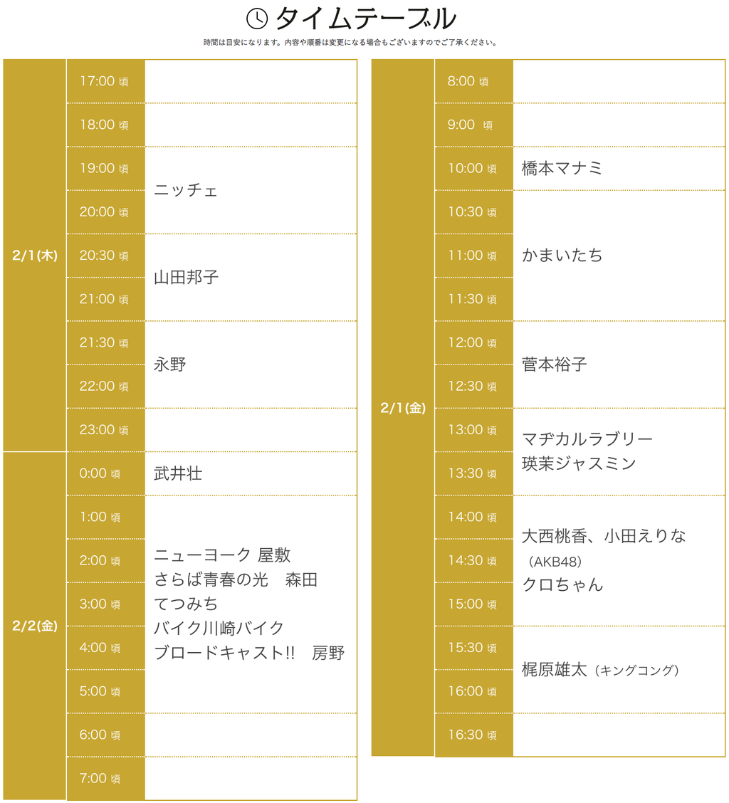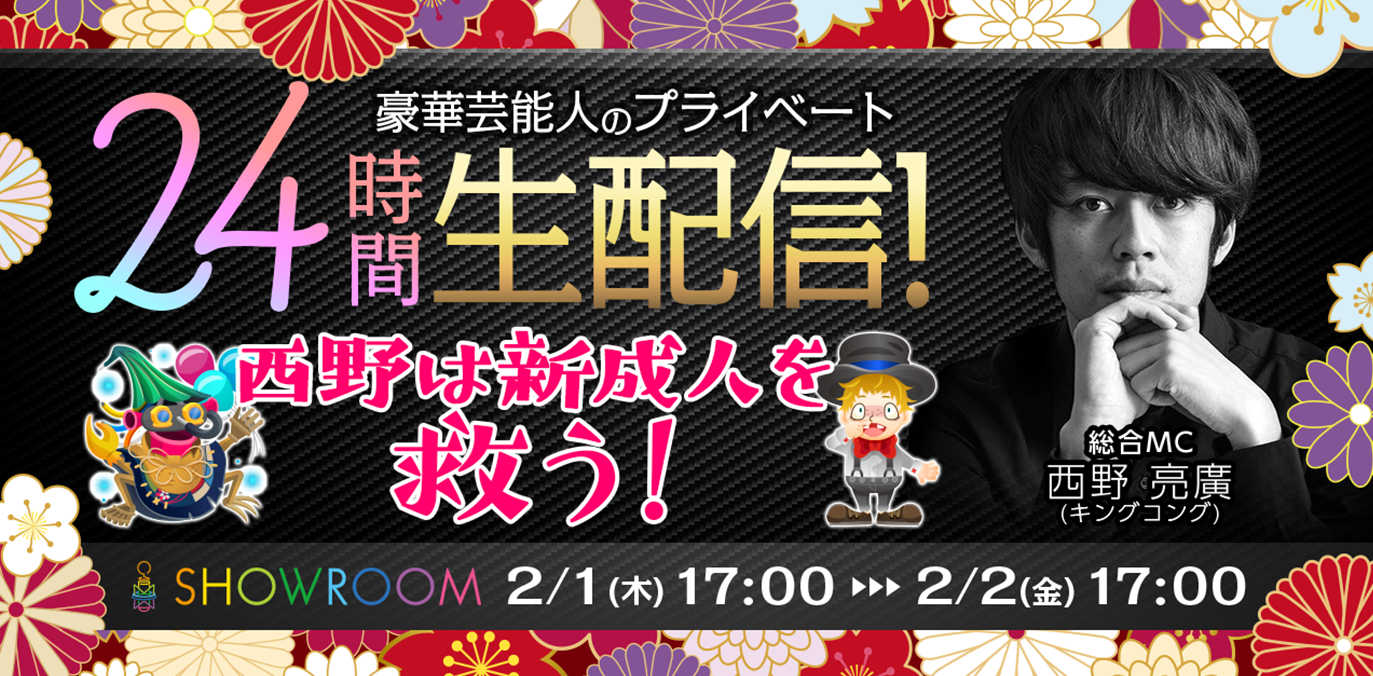 💡出演者決定💡2/1 17:00〜『豪華芸能人のプライベート24時間生配信”西野は新成人を救う”』のゲスト出演者が発表されました🎉https://t.co/QR8B6jxJzA …#西野亮廣,#梶原雄太,#ニッチェ,#山田邦子,#橋本マナミ,#かまいたち,#大西桃香,#小田えりな,#AKB48,#クロちゃん,