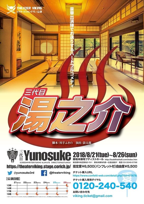 濵咲友菜と人見古都音の舞台出演が決定!!https://toyota-team8.jp/news/kanto/20180717-983707517031579.php8月21日(火)〜26日(日)に上演されるTheaterViking主催の舞台「三代目湯之介」に、AKB48チーム8 滋賀県代表・濵咲友菜と、岡山県代表・人見古都音が出演することが決定しました!!TheaterViking主催舞台「三代目湯之介」脚本:川手ふきの演出:鼓太郎池田湯之介は、老舗旅館・ひととき荘の三代目若旦那。かつて役者を目指し東京で励んでいたが、泣かず飛ばずの末、母親で2代目女将・真知子の病をきっかけに3年前、家業を継ぐために帰って来た。母親の病は回復したが、父親で、2代目の旦那・喜一郎は元々放浪癖の有るとんでもない親父。病み上がりで年老いた母に1人で旅館を切り盛りさせるわけにはいかず、隣町にある大手ホテルの末娘で、学生時代この界隈では評判の美人だった・美佐江との縁組を勧められるがまま受け入れ、籍を入れ、家業を継ぐ事を決意。現在は3代目の旦那として、客入りの悪くなったひととき荘を切り盛りしている。ある日、ひととき荘の顔とも言える柱時計が止まってしまった。従業員たちは女将たちに知られる前に直そうと奮闘、また、湯之介もこの夏はひと儲けしようといつもの大衆演劇ではなく、かつて東京で世話になった先輩の劇団を呼びよせるが......地方の老舗旅館で起こる起死回生の珍騒動。[劇場]築地ブディストホール(東京都中央区築地3-15-1 築地本願寺内第一伝道会館2F)[出演]金すんら/神道明/橋本禎之/榎木薗郁也/蓮田キト/鈴木寿永吉/高峰華/望月未稀/荒澤守/戸塚丈太郎/朝日玲菜/金原みさき/奥村凛/猫田にき/山田唯/柄本航陽/柘植みさき/依田達哉/高沢ふうこ/藤原野乃華/磯部さちよ/梅木駿詳しい情報は公式サイトでご確認ください。