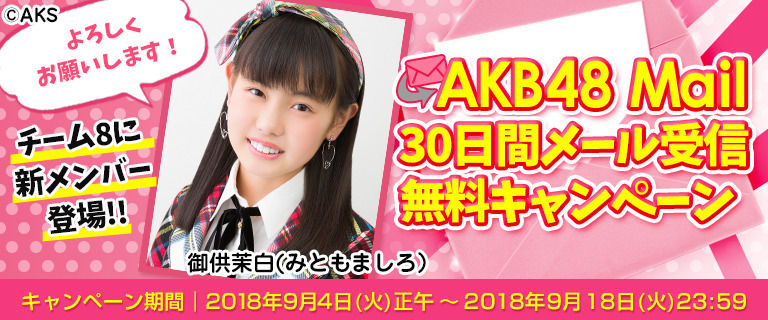 またチーム8新メンバーの参加を記念して、「AKB48 Mail」会員のみなさまを対象に、9月4日(火)から9月18日(火)まで「チーム8新メンバー 30日間メール受信無料キャンペーン」を実施いたします。