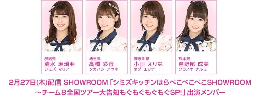2月27日(木)18:00より、清水麻璃亜がSHOWROOM番組「シミズキッチンはらぺこぺこぺこSHOWROOM5皿目~チーム8全国ツアー大告知もぐもぐもぐもぐSP!」を配信!!