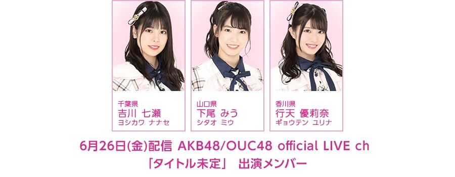 6月26日(金)、吉川七瀬、下尾みう、行天優莉奈の新企画スタート!https://toyota-team8.jp/news/list/20200624-206782840673964.phpAKB48チーム8 吉川七瀬、下尾みう、行天優莉奈がメインを務める新企画の配信が決定しました。チーム8の天然BIG3と言われる3人をコントロールする進行役は田口愛佳さんと西川怜さん。AKB48では後輩にあたる2人、果たしてBIG3に厳しいツッコミをすることは出来るのか?!気になる番組名は「タイトル未定」。配信中に決定いたします。予測不能の新番組、ぜひご視聴ください![配信日程]6月26日(金) 21:00~21:30[出演メンバー]吉川七瀬、下尾みう、行天優莉奈[進行]田口愛佳、西川怜[配信プラットフォーム]
